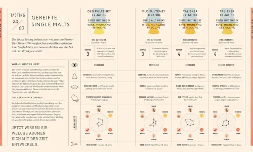 – 20 Verkostungen führen Sie Schritt für Schritt an die verschiedenen Geschmäcker heran. Lernen Sie, Whisky mit allen Sinnen richtig zu schmecken – mit den Augen, mit der Nase, mit der Zunge. Jedes Tasting ist systematisch gleich aufgebaut und geht genau auf die Zusammensetzung des Whiskys, auf Aussehen, Geruch und die verschiedenen Geschmacksnoten ein.