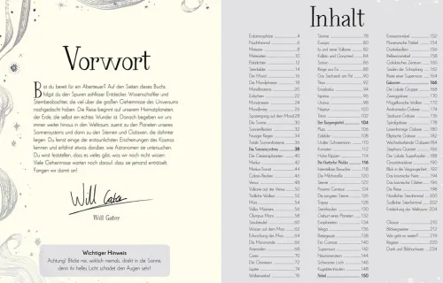 – Über 100 Einblicke in das Weltall für Kinder – von unserem Heimatplaneten Erde aus geht es am Mond vorbei zu den Planeten des Sonnensystems bis zum Kuipergürtel und seinen Himmelskörpern. Im interstellaren Raum fliegt man weiter zu leuchtenden Sternen, bunten Nebeln und fernen Galaxien.