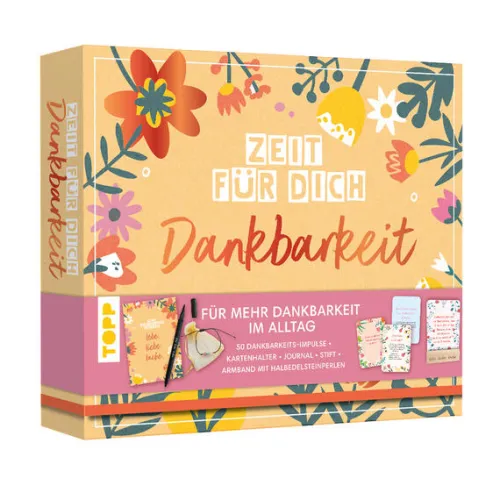 In einer hektischen Zeit mit vielfälltigen Anforderungen kommen Momente der Achtsamkeit häufig zu kurz. Doch für unser Wohlbefinden ist es wichtig, zwischendurch innezuhalten und sich den Momenten und Dingen bewusst zu werden, für die man dankbar sein kann. Die 50 Karten mit kleinen Übungen, Affirmationen und Zitaten helfen dir dabei, den Dankbarkeitsmomenten in deinem Alltag Beachtung zu schenken. Für unterwegs erinnert dich das schöne Armband mit drei Halbedelsteinperlen daran, dass es Vieles gibt, für das man dankbar sein kann.