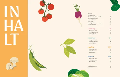 4 Jahreszeiten, 64 Salate: Ob Frühling, Sommer, Herbst oder Winter – Salatsaison ist mit diesem Buch 365 Tage im Jahr! Die bunten und ausgewogenen Mahlzeiten-Salate mit saisonalen Lieblingszutaten versorgen rundum und machen einfach glücklich.