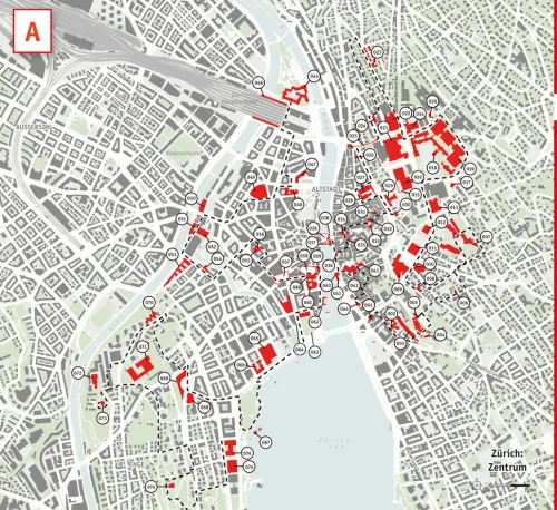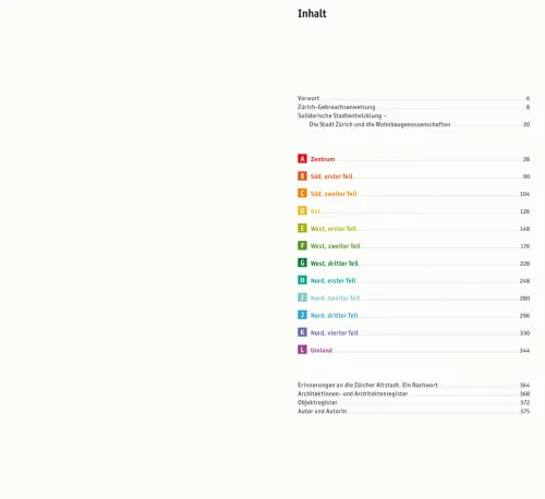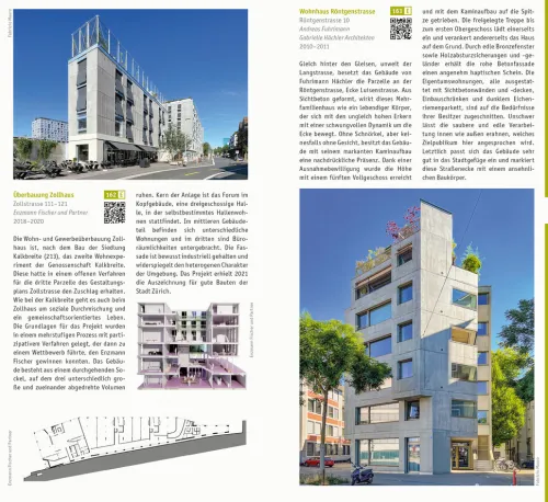 Das Herz dieses Architekturführers bilden elf Spaziergänge, die als praktische Anleitung zu verstehen sind vorausgesetzt man ist, wie die Einheimischen, dem Bergwandern nicht abgeneigt. Sie führen quer durch die oft sehr eigenständigen Stadtkreise und werden begleitet von Aufsätzen zur historischen Entwicklung, zur Bedeutung der Genossenschaften sowie durch eine persönliche Erinnerung an ein längst vergangenes Zürich.