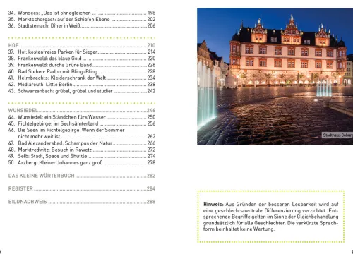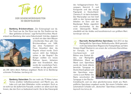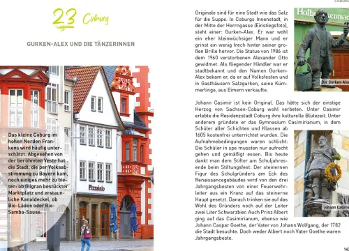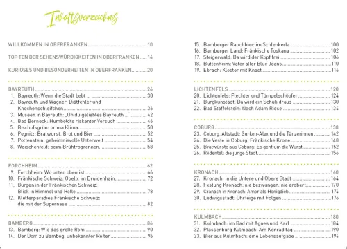 Oberfranken steht ein wenig im Schatten von Unter- und Mittelfranken, bietet aber mit Weltkultur und Mittelalterburgen, Bergen und Wäldern, Bier und Bratwürsten wunderbare Anreize für eine Reise. Es gibt neben dem berühmten Bamberg eben auch Coburg, Kulmbach oder Kronach. Neben der fantastischen Fränkischen Schweiz auch den Frankenwald, Steigerwald und das Fichtelgebirge. Und neben dem bayerischen Staatsbad Bad Steben auch Bad Alexandersbad, Bad Berneck oder Bad Staffelstein. Allein: Die Wenigsten in Deutschland wissen das. Der Autor führt in das Fachwerkhaus, in dem der Vater aller Blue Jeans geboren wurde, zu dem Ort, wo die größten Schneemänner gebaut werden, es geht nach Little Berlin und ins erste Archedorf in Bayern. In Bayreuth ist er auf den Spuren von Richard Wagner, er geht dem Hinweis „Nach Adam Riese“ nach und bestellt eine Wurst beim Hofer Wärschtlamo. So entstand ein rundes Gesamtbild von Oberfranken mit seinen vielen schönen und bezahlbaren Familienbetrieben, ob in Hotellerie oder Gastronomie. Der Gast darf sich auf eine herzhaft- bodenständige Küche freuen. Die Tipps dazu sind handverlesen. 50 Ziele in Oberfranken und noch mehr Erlebnisse: Lassen Sie sich überraschen von diesem so schönen und häufig noch unbekannten Oberfranken, das für jeden recht nah liegt: nämlich in der Mitte von Deutschland.