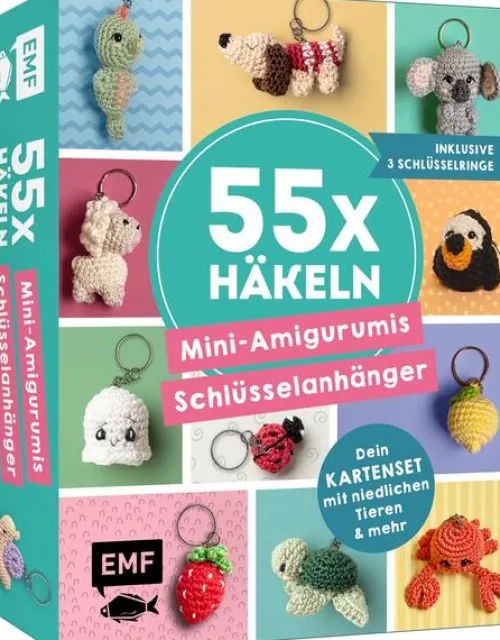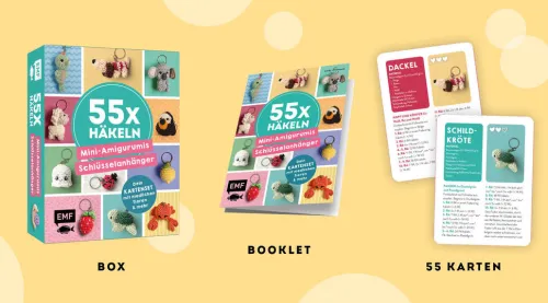 Entdecke die wohl niedlichste Sammlung gehäkelter Minifiguren in einer Box: 55 Karten mit liebevoll gestalteten Anleitungen für Tiere, Glücksbringer, Früchte und mehr – von Dackel und Panda über Regenbogen bis zu Sonnenblume und Donut. Jede Karte zeigt ein Foto des fertigen Projekts und erklärt Schritt für Schritt, wie du deinen eigenen Mini-Amigurumi-Schlüsselanhänger häkelst. Ein illustriertes Booklet mit allen Häkelgrundlagen sorgt dafür, dass auch Anfänger*innen sofort loslegen können. Außerdem liegen in der Box drei Schlüsselringe bereit, sodass deine fertigen Amigurumis direkt einsatzbereit sind.