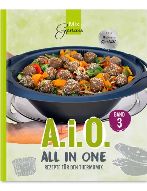 AIO3 weil wir es einfach lieben mit dem Thermomix zu kochen! Auch im 3. Band unseres Bestsellers erwarten Sie wieder jede Menge tolle All-in-One Rezepte für den Thermomix. Egal ob mit Varoma oder auch nur One-Pot. Die Vielfalt an leckeren und einfachen Gerichten ist riesig. Zartes Hähnchenfilet in cremiger Sauce, Lachs mit Pasta und Rucolapesto oder vegetarische Spätzle mit buntem Gemüse. Entdecken Sie über 50 neue Rezepte, die alle am Küchentisch zum Schwärmen bringen. So cook AiO and be happy! 🙂