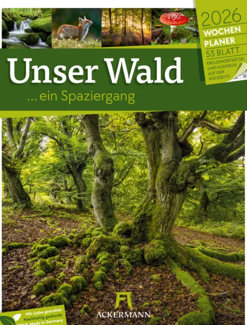 Wie alle Ackermann-Kalender ausschließlich in Deutschland auf Papier gedruckt, das aus vorbildlich bewirtschafteten, FSC®-zertifizierten Wäldern und anderen kontrollierten Quellen stammt. Transparente CO2-Kompensation in Kooperation mit unserem Klimapartner NatureOffice, bei der nachweislich Treibhausgase reduziert sowie die lokale Umwelt und die Belange der Bevölkerung gefördert werden. Auch eine schöne Geschenkidee für Wald- und Naturverbundene, Ruhesuchende und Achtsamkeits-Fans, Freund:innen heimischer Wildtiere und natürlich für alle, die Spaß an Rätseln und Sudoku haben.