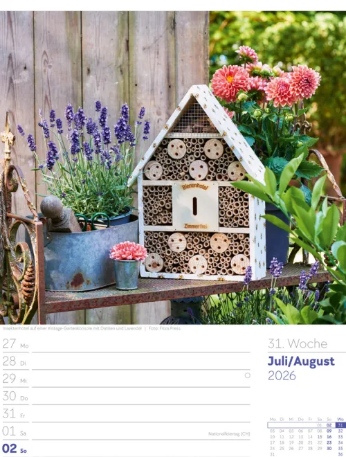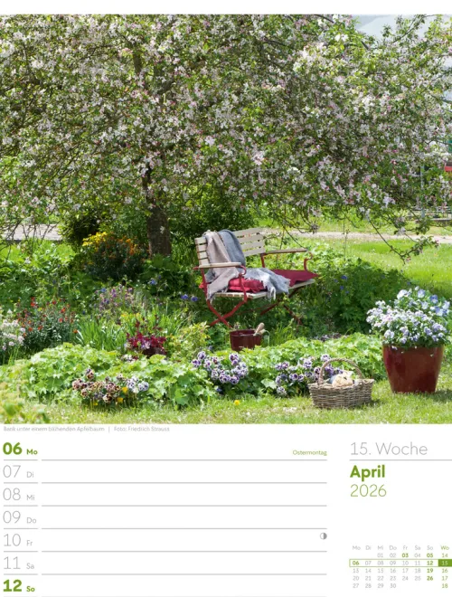„Einer der schönsten Wege zu uns selbst führt durch einen Garten.“ Wenn Sie dieser Aussage zustimmen und selbst Ruhe und Ausgeglichenheit beim Blick auf Grünes und Blühendes finden, wird Ihnen dieser Wochenkalender tagtäglich Freude bereiten. Blumen- und Gartenspezialist:innen wie Friedrich Strauß, Marianne Majerus oder Flora Press halten die herrlichsten Gartenparadiese im Bild fest und haben dabei auch die Details im Blick. Übersichtliches Kalendarium mit Platz für Ihre Einträge und dazu jede Woche neuer Rätselspaß: Kreuzworträtsel und Sudokus auf allen Rückseiten.