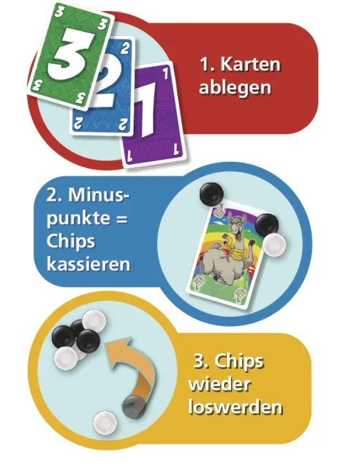 - Wer alle Karten losgeworden ist, darf einen 1er- oder 10er-Chip wieder abgeben.