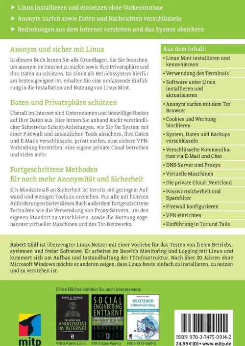 In diesem Buch lernen Sie alle Grundlagen, die Sie brauchen, um anonym im Internet zu surfen sowie Ihre Privatsphäre und Ihre Daten zu schützen. Da Linux als Betriebssystem hierfür am besten geeignet ist, erhalten Sie eine umfassende Einführung in die Installation und Nutzung von Linux Mint.