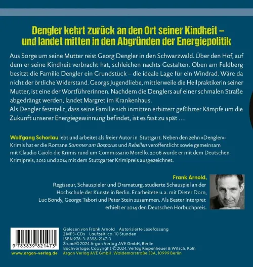 Aus Sorge um seine Mutter reist Georg Dengler in den Schwarzwald. Über den Hof, auf dem er seiner Kindheit verbracht hat, schleichen nachts Gestalten. Oben am Feldberg besitzt die Familie Dengler ein Grundstück – die ideale Lage für ein Windrad. Wäre da nicht der örtliche Widerstand. Georgs Jugendliebe, mittlerweile die Heilpraktikerin seiner Mutter, ist eine der Wortführerinnen. Nachdem die Denglers auf einer schmalen Straße abgedrängt werden, landet Margret im Krankenhaus – und ihr Sohn ist endgültig beunruhigt.