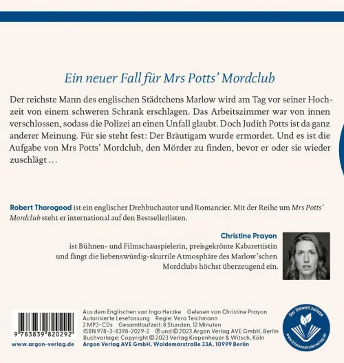 Doch während der Feierlichkeiten ertönt aus dem Haus ein lautes Krachen, und als alle ins Haus stürzen, finden sie den Bräutigam von einem schweren Schrank erschlagen in seinem Arbeitszimmer vor. Das Arbeitszimmer war von innen verschlossen, sodass die Polizei an einen Unfall glaubt. Doch Judith Potts ist da ganz anderer Meinung. Für sie steht fest: Peter wurde ermordet. Und es ist die Aufgabe des Mrs Potts‘ Mordclub, den Mörder zu finden, bevor er oder sie wieder zuschlägt . . .