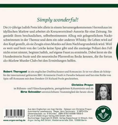Die siebenundsiebzigjährige Judith Potts lebt allein in einem Herrenhaus im idyllischen Marlow und arbeitet als Kreuzworträtsel-Autorin. Sie genießt ihren beschaulichen Alltag mit gelegentlichem Nacktschwimmen in der Themse. Ihr Leben wird jedoch auf den Kopf gestellt, als sie Zeugin eines Mordes auf dem Nachbargrundstück wird. Weil es weit und breit von der Leiche keine Spur gibt und die Polizei den Fall nicht ernst nimmt, beginnt Judith, auf eigene Faust zu ermitteln. Dabei lernt sie die Hundesitterin Suzie und die neurotische Pfarrersfrau Becks kennen, die ihr fortan als »Marlow Murder Club« bei den Ermittlungen helfen. Als es zu einem weiteren Mord kommt, erscheint der Fall immer rätselhafter . . .