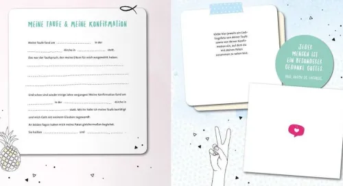Dieses Konfirmationsalbum bietet neben viel Platz für Fotos zahlreiche Möglichkeiten zum Eintragen, um die persönlichen Erinnerungen an die Vorbereitungszeit, den Gottesdienst und die Feier der Konfirmation festzuhalten. Durch die moderne, freche Gestaltung und die zeitgemäßen Texte ist es ein ideales Geschenk für junge Konfirmandinnen an ihrer Konfirmationsfeier. Mit dieser Geschenkidee für Mädchen schenkt man die Möglichkeit, einen wertvollen Erinnerungsschatz an diesen besonderen Festtag zu erstellen. Das junge Design lädt zum Eintragen von Gedanken und Wünschen sowie zum Aufbewahren von Fotos ein – so macht das Aufschreiben von Erinnerungen Spaß!