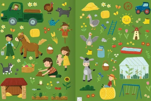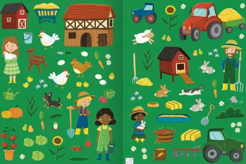 Auf dem Bauernhof geht es drunter und drüber: Entdecke das hübsche Bauernhaus, die verschiedenen Koppeln und die Stallungen der Tiere und erwecke alle Szenen mit den über 250 kuscheligen Aufklebern zum Leben!