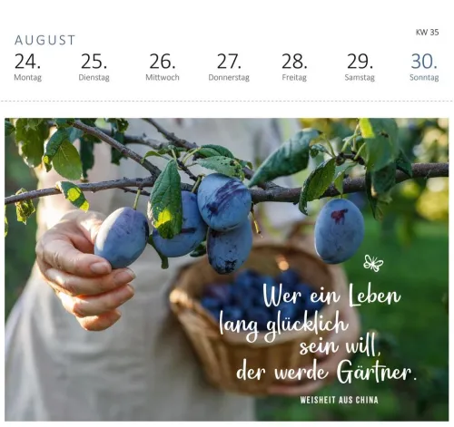 Ein tolles Geschenk für alle, die gern Zeit im Garten verbringen und beim Blick in die Natur ihre innere Ruhe finden. Der Kalender mit Postkarten bringt die schönsten Gartenmomente mitten auf den Schreibtisch. Jedes Mal aufs Neue inspiriert dieser Wochenkalender 2026 mit liebevollen Lebensweisheiten zu mehr Entspannung, Gelassenheit und Dankbarkeit. Mit dem praktischen Wochenkalendarium behält man stets den Überblick, egal ob im Büro oder zu Hause. Die Postkarten mit stimmungsvollen Fotografien lassen sich an der Perforation heraustrennen und können so an liebe Menschen verschickt werden.