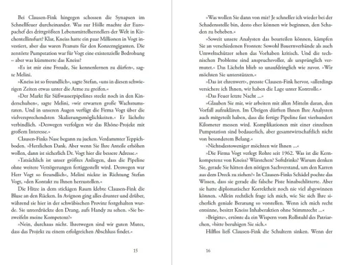Die Widerstände sind enorm: Bauernverbände, Umweltorganisationen und die lokale Politik haben jeweils ihre eigenen Gründe, das Projekt verhindern zu wollen. Als eine Pumpstation in Flammen aufgeht, wird die Kommunikationsexpertin Cecilia Thoma von Hamburg nach Avignon beordert. Vorgeblich soll sie die brodelnde Öffentlichkeit beruhigen. Doch als Unbekannte sie mit dem Tode bedrohen, beginnt sie selbst zu recherchieren und findet heraus: Unter den zahlreichen Kräften, die die Pipeline verhindern wollen, haben die gefährlichsten ihre Wurzeln in der eigenen Firma . . .