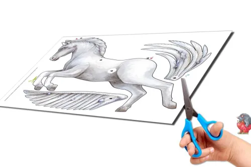 Ausschneiden, Zusammenkleben, Faden knüpfen und fertig sind die 3d fliegenden, fantasievollen Tiere zum Aufhängen oder Dekoration. Liebevoll und detailreich illustriert von Kurt Völtzke fliegen Elfe und Fee auf dem Pegasus durch die Nacht. Inhalt Bastelset: ein Bastelheft mit 7 Bastelbögen beidseitig bedruckt, 4 Tiere (Pegasus, Seepferdchen, Wal und Gans), einer Elfe und einer Fee Benötigt werden: Schere, Leim und etwas Faden zum AufhängenSchwierigkeitsgrad Bastelbuch: einfach, anspruchsvolle Formen zum Schneiden, einfache Montage mit Hilfe und unter Aufsicht von Erwachsenen, Bastelzeit: ca. 3 Stunden für den gesamten Bastelbogen, 1 Tier klein ca. 0, 5 StundeGröße Pegasus: ca. 41 cm x 33 cmGröße Wal: ca. 23 cm x 11 cmGröße Bogen: 24cm x 32cmAusführung: Bastelheft, beidseitig bedruckt auf FSC zertifiziertem hochwertigem Papier, gedruckt in der Europäischen UnionBastelanleitung: deutsch, englisch, spanisch, französisch, italienisch Illustrierte Ausgabe
