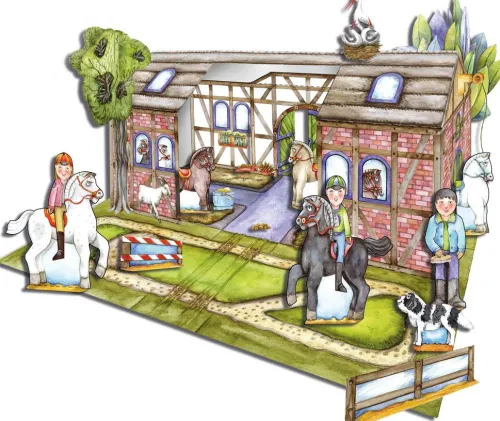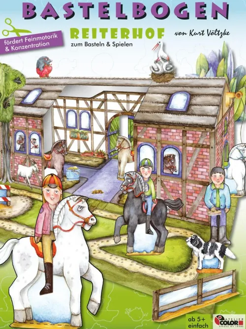 Nach dem Ausschneiden und Basteln werden in den idyllischen Stallungen Pferde geputzt und gestriegelt. Durch die stabile und offene Konstruktion lässt sich der Hof gut Bespielen auch im Innenraum und mit bereits vorhandenen Tieren ergänzen. Eine ideale Beschäftigung für daheim und unterwegs zur Förderung der Feinmotorik und Konzentration im Vor- und Grundschulalter. Gedruckt auf FSC zertifiziertem Papier in der EU, Druckfarben mit European Standard EN 71/3 für SpielzeugSeit über 30 Jahren ein Bastelspaß für die ganze Familie aus Deutschland. Kreatives Papierspielzeug – bespielbarer Reiterhof mit Pferden8 Seiten liebevoll und detailreich illustriert vom renommierten Designer Kurt Völtzke. Größe Pferde: ca. 12 x 12 cmGröße Stallung: ca. 31 x 23 cmUmfang: 8 Blatt Bastelbogen ( davon 1 Titel)Größe Bogen: 24 x 32 cmSchwierigkeitsgrad: einfache Formen zum Schneiden, einfache Konstruktion, für Vor- und Grundschulalter Illustrierte Ausgabe