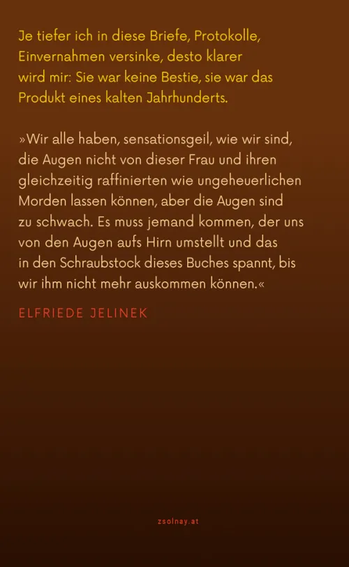 »Wir alle haben, sensationsgeil, wie wir sind, die Augen nicht von dieser Frau und ihren gleichzeitig raffinierten wie ungeheuerlichen Morden lassen können, aber die Augen sind zu schwach. Es muss jemand kommen, der uns von den Augen aufs Hirn umstellt und das in den Schraubstock dieses Buches spannt, bis wir ihm nicht mehr auskommen können. « Elfriede JelinekElfriede Blauensteiner, bekannt als »schwarze Witwe«, wurde Anfang 1996 verhaftet und später wegen mehrfachen Mordes an Pflegefällen und Partnern verurteilt. Hier spricht sie in einer dokumentarischen Selbstaufzeichnung. Was man hier liest, ist kein Roman, kein Krimi, sondern ein aufgeschriebenes Leben. Hier wird ausgesagt. Aus Protokollen, Gutachten, Auskünften entsteht ein Monolog, der uns zwingt, unsere Vorstellungen von Schuld, Gerechtigkeit und Empathie neu zu justieren. Natürlich geht es darin um Schuld, aber nicht im juristischen Sinn. Ja, diese Frau hat Menschen ermordet. Aber wer mit sieben Jahren weiß, dass die eigene Mutter den Tod des Kindes mehr ersehnt als seine Gesundung, der entwickelt keinen Sinn für Moral. Es gibt Bücher, die lassen sich nicht weglegen. Nicht, weil sie unterhaltsam sind, sondern gerade, weil sie kaum erträglich sind. »Ausreden« ist ein solches Buch.