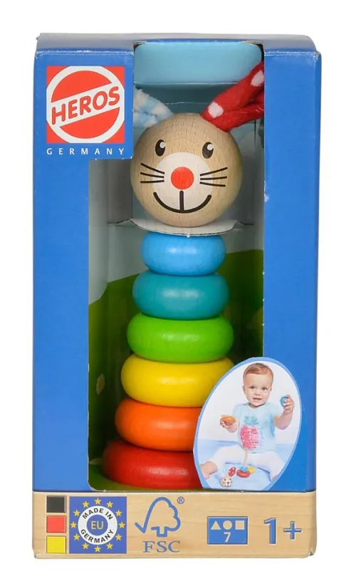 Die Neuheit Heros Baby Steckfigur besteht aus sechs verschiedenen großen, bunten Holzringen, die der Größe nach aufgesteckt werden. Der süße Hasenkopf mit Plüschohren bildet den Abschluss. Mit dem Stecktier wird sowohl die Motorik als auch die Hand-Augen-Koordination der Kinder gefördert.