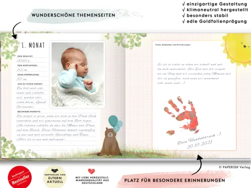 Der PAPERISH Verlag und Pia Loewe haben ein bezauberndes Babyalbum für die schönsten Erinnerungen und wichtigsten Momente der ersten Jahre gestaltet. Dieses besondere Babybuch erfüllt nicht nur höchste gestalterische Ansprüche, es bietet spannende kreative Eintragmöglichkeiten mit Platz für die schönsten Photos und Erinnerungen. Themen wie die eigene Familie, Geburt und die Zeit danach werden genauso behandelt wie das erste Lächeln, die ersten Schritte sowie die wichtigsten Meilensteine in der Entwicklung.