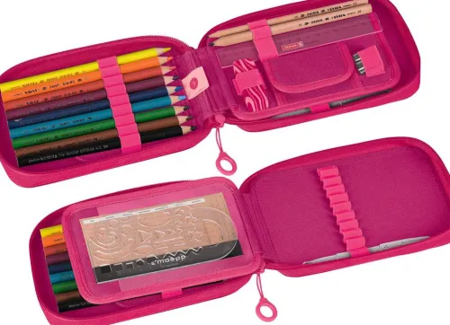 B/H/T: 200×125×45 mm, Kunstfaser, Farbe: tulip, Inhalt: 9 dicke Markenbuntstifte, 2 Markenbleistifte, Lineal 16 cm, Metalldoppelspitzer, Radiergummi, Geldfach mit Klettverschluss, Stundenplan, Zeichenschablone, innovative Stifterampe für leichteres Entnehmen, horizontales Öffnen spart Platz auf dem Schreibtisch, mit ergonomischem Zipper für müheloses Öffnen und Schließen Kunstfaser, B/H/T: 200×125×45 mm.