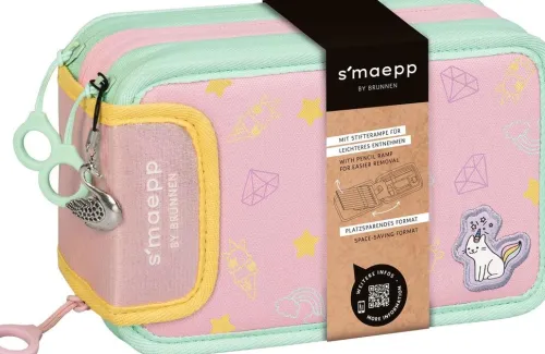 B/H/T: 200×125×75 mm, Kunstfaser, Farbe: mehrfarbig, pastell, mit Anhänger, 3 Reißverschlüsse, Inhalt: 18 dünne Markenbuntstifte, 9 dicke Markenbuntstifte, 2 Markenbleistifte, Lineal 16 cm, Metalldoppelspitzer, Radiergummi, Kinderschere, Geldfach mit Klettverschluss, innovative Stifterampe für leichteres Entnehmen, horizontales Öffnen spart Platz auf dem Schreibtisch, mit ergonomischem Zipper für müheloses Öffnen und Schließen Kunstfaser, B/H/T: 200×125×45 mm.