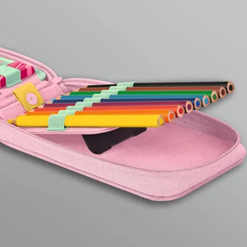 B/H/T: 200×125×45 mm, Kunstfaser, Farbe: mehrfarbig, pastell, mit Anhänger, Inhalt: 9 dicke Markenbuntstifte, 2 Markenbleistifte, Lineal 16 cm, Metalldoppelspitzer, Radiergummi, Geldfach mit Klettverschluss, Stundenplan, Zeichenschablone, innovative Stifterampe für leichteres Entnehmen, horizontales Öffnen spart Platz auf dem Schreibtisch, mit ergonomischem Zipper für müheloses Öffnen und Schließen Kunstfaser, B/H/T: 200×125×45 mm.