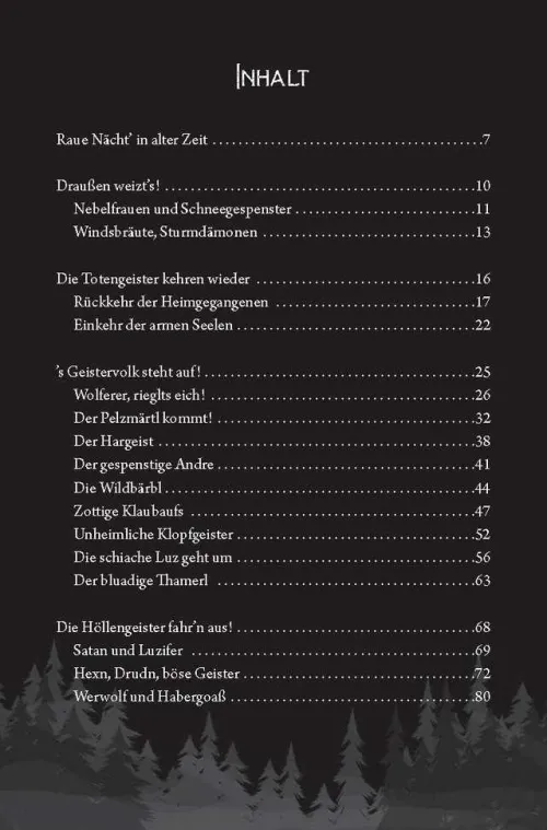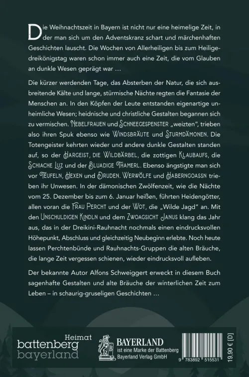 Die Weihnachtszeit in Bayern ist nicht nur eine heimelige Zeit, in der man sich um den Adventskranz schart und märchenhaften Geschichten lauscht. Die Wochen von Allerheiligen bis zum Heiligedreikönigstag waren schon immer auch eine Zeit, die vom Glauben an dunkle Wesen geprägt war. . . Die kürzer werdenden Tage, das Absterben der Natur, die sich ausbreitende Kälte und lange, stürmische Nächte regten die Fantasie der Menschen an. In den Köpfen der Leute entstanden eigenartige unheimlicheWesen; heidnische und christliche Gestalten begannen sich zu vermischen. Nebelfrauen und Schneegespenster „weizten“, trieben also ihren Spuk ebenso wie Windsbräute und Sturmdämonen. DieToten geister kehrten wieder und andere dunkle Gestalten standen auf, so der Hargeist, die Wildbärbel, die zottigen Klaubaufs, die Schiache Luz und der Bluadige Thamerl. Ebenso ängstigte man sich vor Teufeln, Hexen und Druden. Werwölfe und Haberngoaßn trieben ihr Unwesen. In der dämonischen Zwölfenzeit, wie die Nächte vom 25. Dezember bis zum 6. Januar heißen, führten Heidengötter, allen voran die Frau Percht und der Wot die „Wilde Jagd“ an. Mit den Unschuldigen Kindln und dem Zwoagsicht Janus klang das Jahr aus, das in der Dreikini-Rauhnacht nochmals einen eindrucksvollen Höhepunkt, Abschluss und gleichzeitig Neubeginn erlebte. Noch heute lassen Perchtenbünde und Rauhnachts-Gruppen die alten Bräuche, die lange Zeit vergessen schienen, wieder eindrucksvoll aufleben. Der bekannte Autor Alfons Schweiggert erweckt in seinem neuen Buch sagenhafte Gestalten und alte Bräuche der winterlichen Zeit zum Leben – in schaurig-gruseligen Geschichten . . .