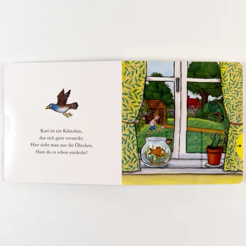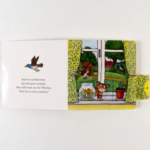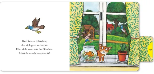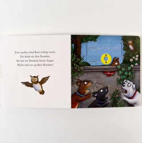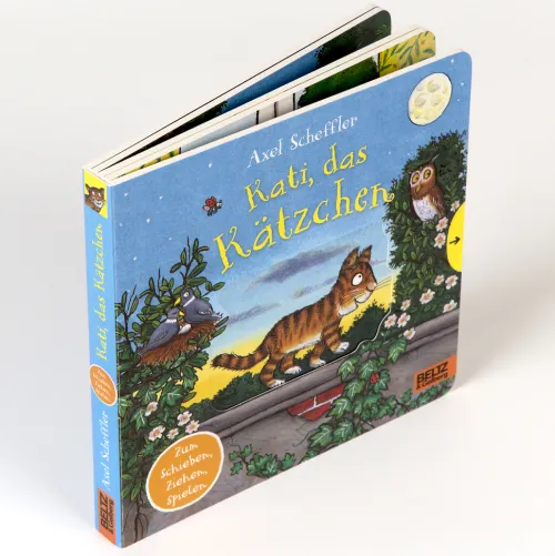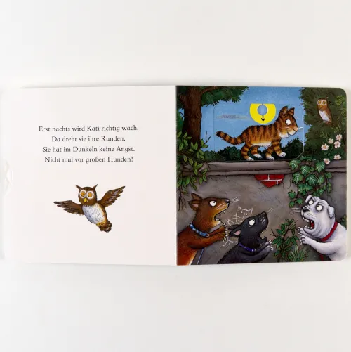Kati, das Kätzchen ist bei Tag gern zu Haus und ruht sich aus, nachts wird sie wach und dreht ihre Runden und hat nicht mal Angst vor Hunden. Eine vergnügliches Pappbilderbuch von dem Illustrator des Grüffelo mit einfachen und lustigen Versen, in denen kleine Kinder mit dem kleinen Kätzchen miauen können. Mit je vier Elementen zum Schieben und Ziehen.