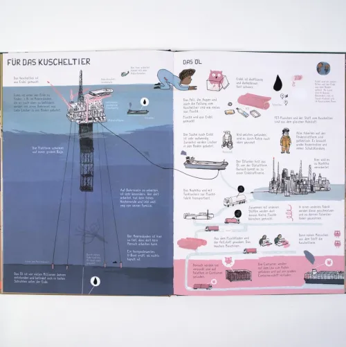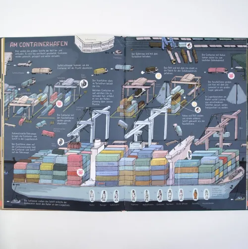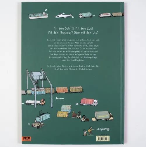 Mit dem Schiff? Mit dem Zug? Mit dem Flugzeug? Oder mit dem Lkw? In detailreichen Bildern und kurzen Texten führt Julia Dürr durch das große Thema der Globalisierung. Irgendwie reisen deine Sachen von einem Ende der Welt bis zu dir nach Hause. Aber wie und warum? Dieses Buch begleitet einen Schokoaufstrich, einen Stuhl und ein Kuscheltier. Wie wird aus Öl ein Kuscheltier? Und wie kommt es im Versandpaket bis zu deiner Haustür? Die Wege der Sachen führen uns durch aufregende Orte wie den Containerhafen, den Güterbahnhof, das Hochregallager oder an den Frachtflughafen.