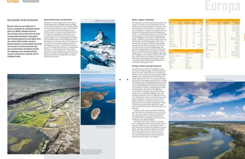 Ein vorgelagerter thematischer Teil beschäftigt sich mit der Erde als Teil des Universums und als Lebensraum. Ein weiterer Abschnitt zeigt eindrückliche Satellitenaufnahmen. Das Länderlexikon liefert aktuelle Daten und Fakten zu allen Staaten unserer Erde. Mit Auflistung und Beschreibung aller aktuellen UNESCO-Welterbestätten und ergänzten Nationalparks in den europäischen Karten.