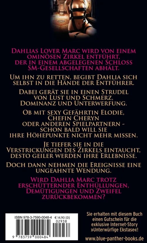Dahlias Lover Marc wird von einem ominösen Zirkel entführt, der in einem abgelegenen Schloss SM-Gesellschaften abhält. Um ihn zu retten, begibt Dahlia sich selbst in die Hände der Entführer. Dabei gerät sie in einen Strudel von Lust und Schmerz, Dominanz und Unterwerfung. Ob mit sexy Gefährtin Elodie, Chefin Cheryn oder anderen Spielpartnern – schon bald will sie ihre Höhepunkte nicht mehr missen. Je tiefer sie in die Verstrickungen des Zirkels eintaucht, desto geiler werden ihre Erlebnisse. Doch dann nehmen die Ereignisse eine ungeahnte Wendung. Wird Dahlia Marc trotz erschütternder Enthüllungen, Demütigungen und Zweifel zurückbekommen? Diese Ausgabe ist vollständig, unzensiert und enthält keine gekürzten erotischen Szenen.