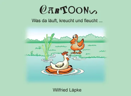 Cartoons zum Thema „Tiere“, – Was da läuft, kreucht und fleucht . . . – unterteilt in 6 Kapiteln (Schneck-schnack, Hundeleben, Hühner-Eierei, Fisch-Salat, Komische Vögel und Was da läuft, keucht und fleucht) mit einer farbigen Zeichnung und einem Vers zum Anfang eines jeden Kapitels.