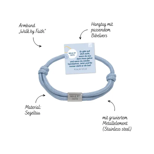 Segeltau-Armband mit christlichem Spruch Walk by Faith als Motiv auf graviertem Metallelement und ermutigendem Bibelvers auf dem Hangtag. aus stabilem Segeltau (100% Polyester)Stärke: 4 mmUmfang verstellbar von 17-26 cmMetallelement: stainless steel (ca. 11 x 12, 5 mm)LasergravurHangtag mit Bibelversermutigende christliche MessageEr gibt auf dich acht, wenn du aus dem Haus gehst und wenn du wieder heimkehrst. Jetzt und für immer steht er dir bei! (Psalm 121, 8)Ein Zeichen des Glaubens, das durch den Alltag begleitet: Dieses Armband trägt ermutigende Bibelworte auf dem Hangtag und ein Symbole des Glaubens, das an Gottes Nähe, Hoffnung und Vertrauen erinnert. Es schenkt Halt in stürmischen Zeiten und erinnert daran, mutig, stark und voller Vertrauen durchs Leben zu gehen. Eine liebevolle Botschaft an sich selbst oder als Geschenk, das von Herzen kommt.