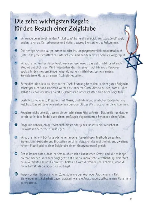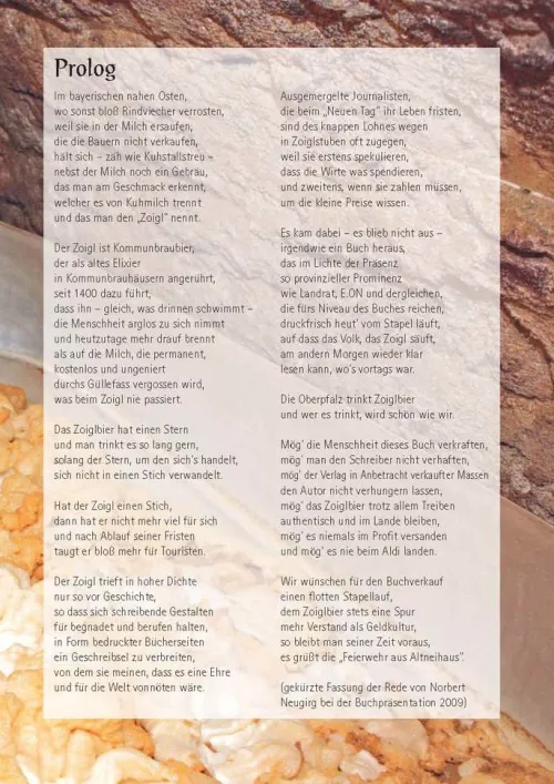 Vorwort Oberpfälzer Wirtschaftswunder 5Prolog 7Ein Oberpfälzer Zaubertrank 6Zehn Zoiglregeln 9Bierverhunzer und Teufelsbrauer 13Hausbrauer gehen in den Untergrund 25Hopfen, Malz und ganz viel Herzblut 43 Eschawo die Zoigl-Hauptstadt 57Neuhaus bleibt beim Bier selbstständig 71Falkenberger Zoigl im Zeichen der Burg 87Mitterteicher Braurecht so alt wie Reinheitsgebot 77Eslarner Bier rettet Oberpfälzer Rebhu hner 99 Sternstunden ohne Sudhaus und Gärbottich 107Wie Nikolaus den Zoigl brachte 115Zoigltradition aus der Frankenpfalz 149Auch Seine Exzellenz serviert Zoigl 155Die Suche nach einer guten Stube 175Alle Zoigl-Wirtschaften auf einen Blick 182Überzoiglt oder Ansichten eines Säufers 190Das Allerletzte 191Quellenverzeichnis/Bildnachweis