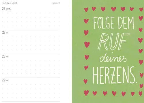 - Terminplaner mit Extraseiten zum Festhalten von Notizen und Erinnerungen