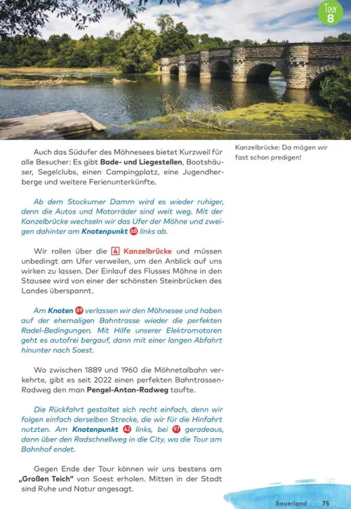 Die 27 schönsten E-Bike Touren im Sauerland Dieser Radwanderführer speziell für E-Biker führt Sie auf 27 ausgewählten Radtouren durch alle Regionen des Sauerlandes. Dabei werden selbstverständlich „Klassiker“ unter die Pneus genommen wie beim Ruhrtal-Radweg, bei der Lenneroute oder rund um die bekannten Stauseen. Aber es werden auch weniger bekannte Regionen erschlossen wie Hönne-, Möhne- oder Baarbachtal. Herausragende Monumente der Industriekultur liegen ebenso am Wegesrand, wie Kirchen, Schlösser und reizvolle Ortskerne. Für eine umweltbewusste An- und Abreise sorgen die Start- und Zielorte, die allesamt an Bahnhöfen liegen. Auf Ladestationen für die E-Bike-Akkus wird ebenso hingewiesen, wie auf Wohnmobil-Stellplätze und herausragende Sehenswürdigkeiten. Den Biker erwartet ein Füllhorn an Sehenswertem, eingebettet in viel Natur, aber auch in quirlige Städte auf bestens ausgeschilderten Radwegen quer durch das Sauerland. Mit GPS-Track-Download der Touren Die Touren: 1 Rundtour von Hagen über Hohenlimburg, 31 km 2 Rundtour von Iserlohn über Sümmern, 41 km 3 Rundtour von Iserlohn über Hemer, 43 km 4 Streckentour von Neuenrade nach Menden, 29 km 5 Rundtour von Werdohl nach Letmathe, 31 km 6 Rundtour von Balve über Amecke, 32 km 7 Streckentour von Arnsberg nach Fröndenberg, 37 km 8 Rundtour von Soest um die Möhnetalsperre, 64 km 9 Rundtour von Warstein über Hirschberg, 35 km 10 Rundtour von Freienohl über Eslohe, 46 km 11 Rundtour von Meschede über Enkhausen, 24 km 12 Rundtour von Brilon über Niederalme, 40 km 13 Rundtour von Willingen über Bontkirchen, 39 km 14 Rundtour von Winterberg über Niedersfeld, 40 km 15 Rundtour von Winterberg über Hallenberg, 40 km 16 Streckentour von Winterberg nach Lennestadt, 56 km 17 Rundtour von Bad Berleburg über Erndtebrück, 38 km 18 Rundtour von Kirchhundem über Oberhundem, 35 km 19 Rundtour Sauerlandring von Lennestadt über Schmallenberg, 83 km 20 Rundtour von Finnentrop über Elspe, 36 km 21 Streckentour von Lennestadt über Plettenberg nach Werdohl, 45 km 22 Rundtour von Attendorn über Finnentrop, 43 km 23 Rundtour von Attendorn über Olpe, 36 km 24 Rundtour von Olpe über Wenden, 27 km 25 Streckentour von Olpe nach Gummersbach, 30 km 26 Rundtour von Meinerzhagen über Velbert, 48 km 27 Rundtour von Marienheide über Kierspe, 32 km Mit Ortsporträts von: Meschede/Iserlohn/Winterberg/Arnsberg/Schmallenberg