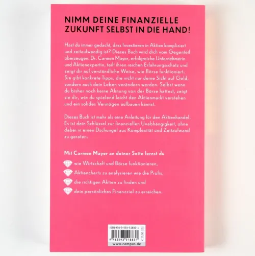 Wer möchte nicht finanziell frei sein? An der Börse reich zu werden und sich den Traum von finanzieller Freiheit zu erfüllen, scheint fast unerreichbar. Was im ersten Moment utopisch klingt, ist aber nicht so abwegig: schließlich zählen Aktien heute trotz aller Risiken nachweislich zu den erfolgreichsten Anlageformen. Mit ihrem Buch möchte Carmen Mayer vor allem Frauen ermutigen und sie mit konkreten Tipps unterstützen, sich mit den eigenen Geldangelegenheiten auseinanderzusetzen und sich ein Vermögen aufzubauen. Sie ist davon überzeugt, dass mit etwas Zeit und Mühe jeder Mensch finanziell unabhängig werden kann. Ihr eigener Werdegang zeigt, dass sich prinzipiell jeder den Wunsch von finanzieller Freiheit erfüllen kann – wenn man es sich nicht nur wünscht, sondern auch handelt.