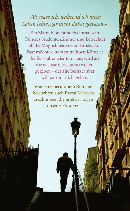 Bestsellerautor Pascal Mercier, der Meister des philosophischen Erzählens, über Loslassen, Freiheit, Erinnerung und die Erfahrung von Vergänglichkeit und ZeitDie Romane »Nachtzug nach Lissabon« und »Das Gewicht der Worte« verführten ein Millionenpublikum dazu, über große Themen wie Identität, Freiheit, Zeit oder den Sinn des Lebens nachzudenken. Nun ist Pascal Mercier in fünf bisher unveröffentlichten Erzählungen auch als Meister der kurzen Form zu entdecken: Kann ein Mann auf dem Höhepunkt seiner Jahre noch einmal die Zeit seines Aufbruchs ins Leben heraufbeschwören? Wann beschädigt Großzügigkeit die Würde eines Künstlers? Gibt es Emotionen, die unser Verstand nicht mehr erreicht? Noch einmal lernen wir mit Pascal Mercier unvergessliche Figuren kennen, die uns mit ihren Gefühlen und Gedanken sehr nahekommen – und dabei unverhofft Einblicke in unser eigenes Selbst eröffnen.