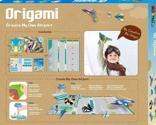 Gestalte deinen eigenen Flughafen mit Hilfe von 40 verschiedenen Origami Papieren. Inklusive Flughafenangestellte, Start- und Landebahn und Tower.