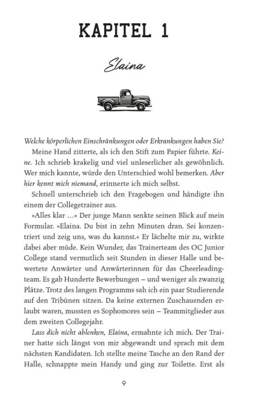 Einmal die Cheerleading Nationals gewinnen – das ist Elainas Traum. Nachdem sie sich ihren Platz im Team des OCJ College erkämpft hat, ist dieser endlich greifbar. Nur eins steht ihr im Weg: ihr Körper. Das Mittel, das sie am Leben hält, ist auch ihr größter Gegner – und ihr bestgehütetes Geheimnis. Niemand darf davon wissen. Schon gar nicht LJ, der Star der OCJC-Cheers.
