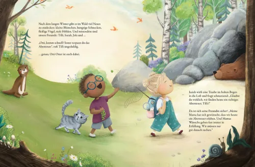 Die vier Freunde Tilli, Isaiah, Otti und Jola finden im Wald einen magischen Knopf. Der kann Wünsche erfüllen – man muss sie nur richtig formulieren und ins Universum schicken. Tilli entdeckt die Unterwasserwelt und Otti reist durch das Weltall, während sich Isaiah durch die Kochtöpfe dieser Erde probiert. Carmen Kroll und Marielle Rusche erschaffen mit Liebe und Fantasie eine Welt voller Abenteuer. Ein zauberhaftes Bilderbuch über die Kraft der Wünsche und Manifestation für Kinder ab 4 Jahren.