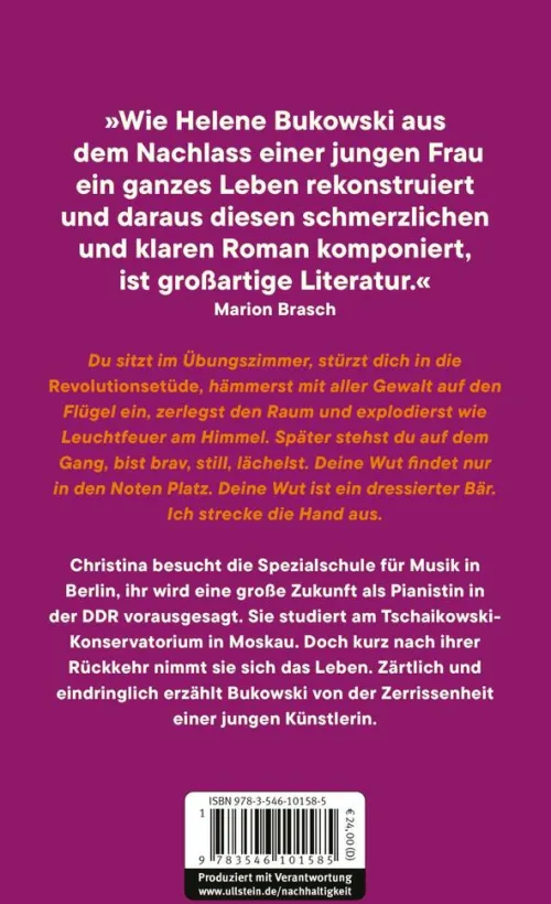 1985 nimmt sich eine junge Pianistin in Neubrandenburg das Leben. Jahrzehnte später stößt die Schriftstellerin Helene Bukowski auf ihre Geschichte. Behutsam nähert sie sich Christina, sucht in ihrer Biografie nach Rissen und Erschütterungen, aber auch nach Augenblicken großen Glücks. Sie lernt einen Vater kennen, der in der Tochter seine eigenen Träume verwirklichen will, eine Mutter, die es liebt, zu fotografieren, und ein Klavier, das unverrückbar in der Wohnung steht. Bukowski folgt Christina nach Berlin, an die Spezialschule für Musik, mit ihren kalten Übungsräumen und dem täglichen Drill. Später nach Moskau, zum Studium am Konservatorium, durch sturzbachartigen Regen und Nächte voller Schnee. Und sie findet eine Krankheit, für die es erst heute eine Diagnose gibt.