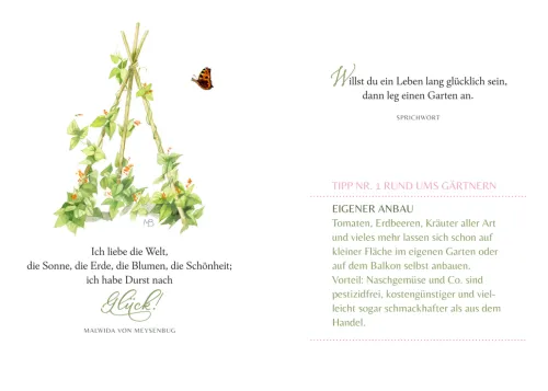 Frisches Obst, grüne Gedanken und jede Menge Lebensfreude – dieses Buch vereint inspirierende Texte und praktische Gartentipps. Ideal für alle mit grünem Herz. Hochwertig ausgestattet mit Strukturpapier, Goldfolie und geprägtem Etikett – ein Geschenk voller Herzenswärme.