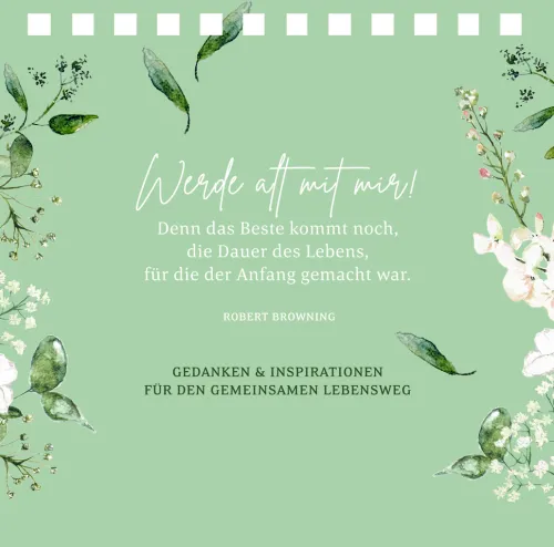 „Werde alt mit mir! Denn das Beste kommt noch, die Dauer des Lebens, für die der Anfang gemacht war“: Unter diesem Motto verbindet dieser edle Spiralaufsteller auf 176 Seiten stimmungsvolle Fotos und liebevolle Illustrationen mit inspirierenden Zitaten und Weisheiten zum Thema Liebe und Ehe. Eine wundervolle Geschenkidee für alle, die dem Brautpaar die besten Wünsche für eine glückliche Zukunft mitgeben möchten – für einen perfekten Start ins Eheglück!