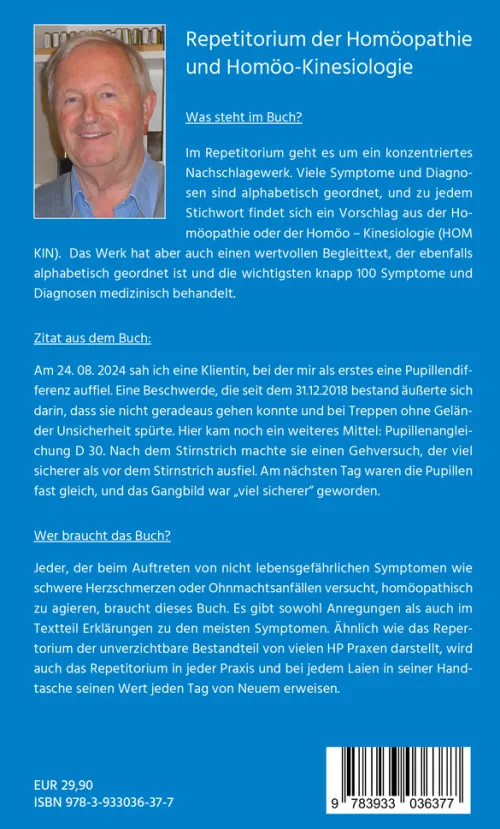 Im Repetitorium geht es um ein konzentriertes Nachschlagewerk. Symptome und Diagnosen sind alphabetisch geordnet, und zu jedem Stichwort findet sich ein Vorschlag aus der Homöopathie oder der Homöo Kinesiologie (HOM KIN). Das Werk hat weiterhin einen wertvollen Begleittext, der ebenfalls alphabetisch geordnet ist und die wichtigsten knapp 100 Symptome und Diagnosen medizinisch behandelt.