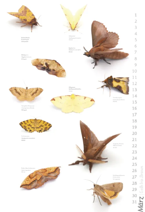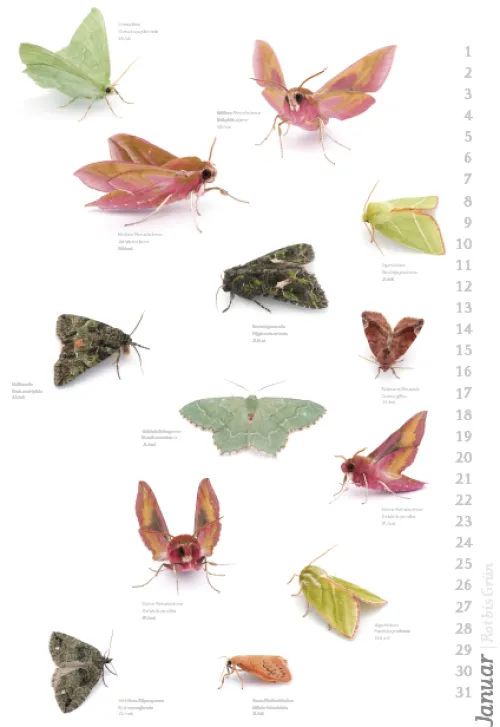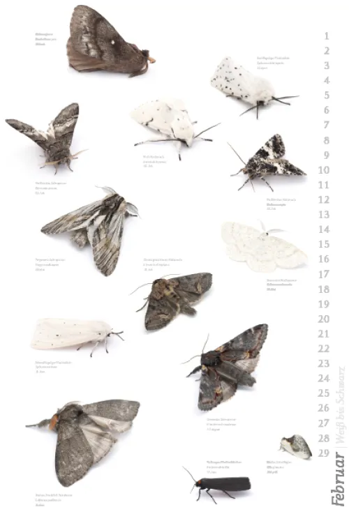 Der Autor und Fotograf Armin Dett hat während eines Beobachtungszeitraums von drei Jahren die Artenvielfallt der Nachfalter am Bodensee dokumentiert. Der Kalender zeigt einen Teil der „Nachtvögel“ mit Namen und Flugzeiten.