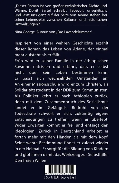 Dieser Roman ist von großer erzählerischer Dichte und Wärme. Die Autorin Dorrit Bartel schreibt liebevoll, unverkitscht und lässt uns ganz auf der Seite von Adane stehen bei seiner Lebensreise zwischen Kulturen und historischen Umwälzungen. (Nina George) Absolut lesenswert in seiner Kombination aus beeindruckendem privatem Lebensweg, eingebunden in die gesellschaftlichen Umbrüche der letzten Jahrzehnte in Äthiopien und Deutschland. (Leserstimme)