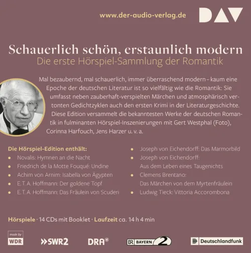Mal zauberhaft, mal schauerlich, immer überraschend modern – kaum eine Epoche der deutschen Literatur ist so vielfältig wie die Romantik. Es entstanden sowohl die ersten Detektivgeschichten als auch viele der schönsten Märchen. Die Beschäftigung mit solch scheinbar gegensätzlichen Themen ist der Kern dieser Epoche: Romantische Schriftsteller suchten das Einzigartige im Geläufigen; das Mystische im Alltäglichen; das Bezaubernde im Schauerlichen. Diese Hörspiel-Edition bietet einen Einblick in das Schaffen der bekanntesten deutschen Romantiker: zauberhaft-verspielte Märchen, spannende Mordfälle und atmosphärisch vertonte Gedichtzyklen. Die Box enthält: Achim von Arnim: Isabella von Ägypten, WDR 1990 Clemens Brentano: Das Märchen vom Myrtenfräulein, Rundfunk der DDR 1985 Joseph von Eichendorff: Aus dem Leben eines Taugenichts, BR 1957 Joseph von Eichendorff: Das Marmorbild, SWF 1953 Friedrich de la Motte Fouqué: Undine, Rundfunk der DDR 1980 E. T. A. Hoffmann: Das Fräulein von Scuderi, SWR 2001 E. T. A. Hoffmann: Der goldene Topf, Rundfunk der DDR 1979 Novalis: Hymnen an die Nacht, Deutschlandfunk 2008Ludwig Tieck: Vittoria Accorombona, WDR 1964Hörspiel mit Gert Westphal, Corinna Harfouch, Jens Harzer14 CDs | ca. 14 h 4 min CD Standard Audio Format.