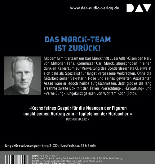 Mit dem Ermittlerteam um Carl Mørck trifft Jussi Adler-Olsen den Nerv von Millionen Fans: Die Fälle 4 bis 6 Verachtung, Erwartung und Verheißung wurden bereits kurz nach Erscheinen zu internationalen Bestsellern. Carl Mørck, der mit seinem Sonderdezernat Q die undankbare Aufgabe hat, ungelöste und scheinbar unlösbare Falle wieder aufzunehmen, hat sich dank seines Spürsinns und seiner treuen Helfer als Meister herausgestellt, eben diese schwierigen Fälle zu lösen. Endlich gibt es die neue Fan-Box zum günstigen Preis!